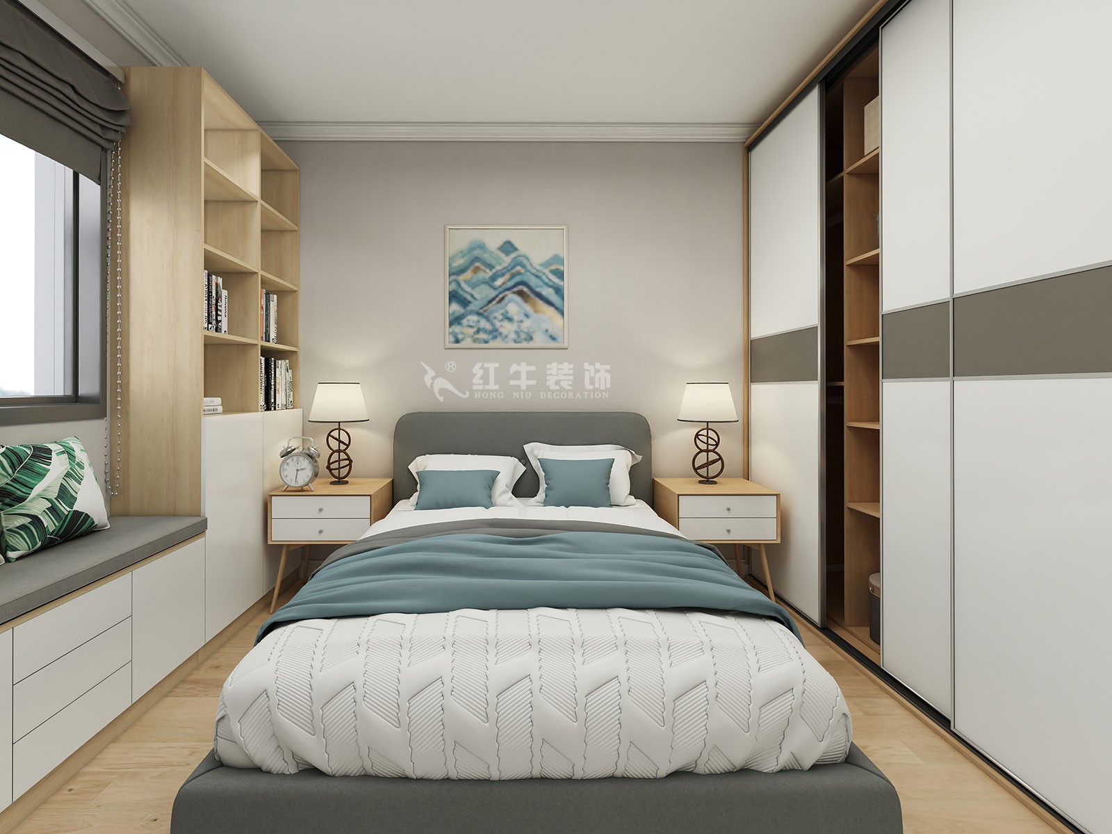整體現代北歐風格的設計,素雅的多人沙發,客廳在功能方面是會客休閑,整體的客廳設計象征著主人品位。深色地毯的搭配讓整個客廳在開放式中似乎又與餐廳相區別開來。簡約大方的地板設計,正方體似的的長桌簡約而時尚。搭配上顯眼的綠色植物讓整個客廳呈現出一種生機勃勃的自然美。臥室是整套房子中最私人也是最體現出溫馨休閑感的空間,一般在設計時要體現出靜謐舒適的感覺,并且與其他空間明顯的區別。在設計時一般會根據主人的個性要求去設計。在這套方案效果中,臥室以白色這種淡然明亮的色調出現,它的整個面積并不大,由于臥室的核心設計是床與衣柜,所以除了擺設這簡約的雙人床和臥室必備的衣柜、以外,沒有再過多的放置其它物品。整個臥室呈現出一種淡靜的清新感,簡約而素雅。