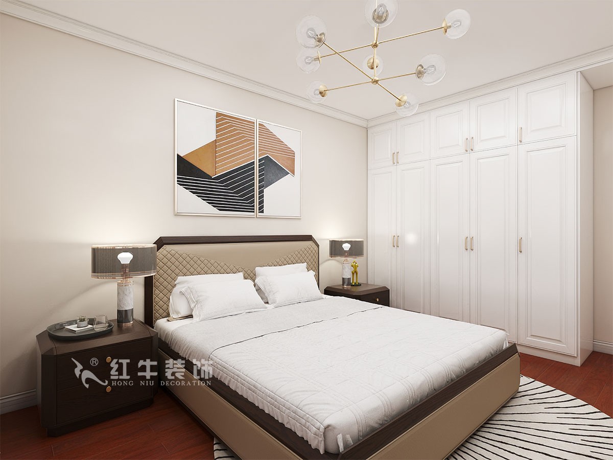 本案以輕松愉悅的現代風設計感與溫馨家的氛圍為出發點,公共區域客廳用暖灰墻布。私密區域,次臥增加梳妝臺,床頭一側的小吊燈,不對稱的設計,不拘一格。主臥暖色乳膠漆搭配白色的衣柜,顯得空間溫馨舒適又具有足夠的儲藏空間。整體營造現代風與溫馨家的氛圍。