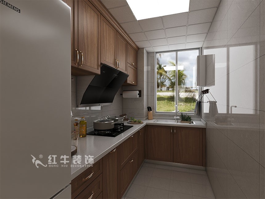 長方形的廚房設計成L型,底部的櫥柜加上方的吊柜,滿足收納需求。窗戶下方做水槽,水槽和灶臺的中間作為操作臺,洗切炒的動線非常流暢。