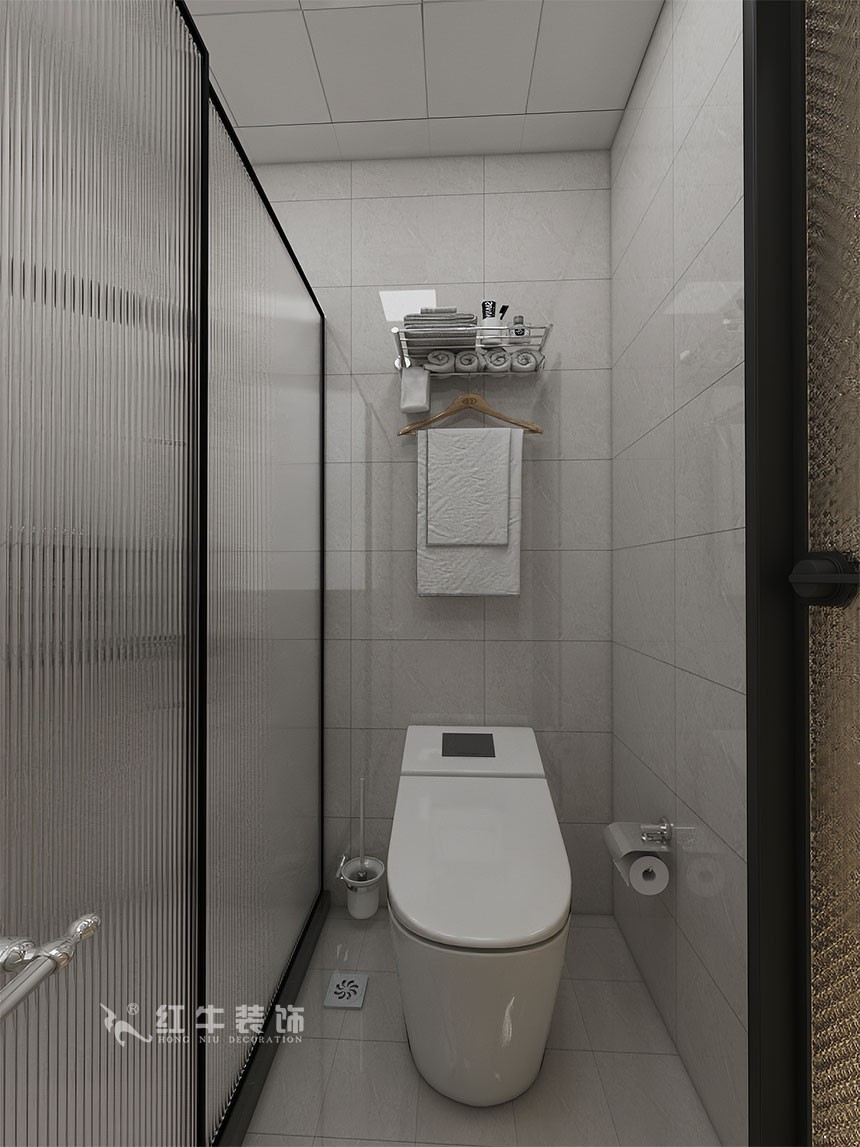 淋浴區用玻璃隔絕水汽,干濕分離。豎條玻璃在視覺上有拉高層高的效果,是一種簡約干練的美學表達。