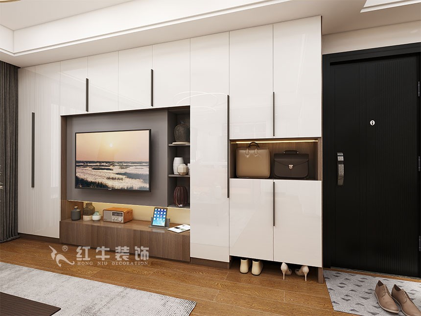 電視背景墻選用柜體做造型,簡潔大方,玄關也能更好地整合進去,避免背景墻太短顯得小氣。