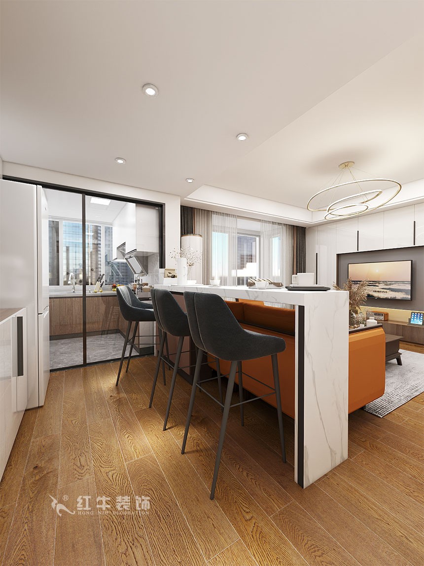 廚房區域進行大改,中西廚兼具,西廚的吧臺作為沙發墻與客廳形成一個整體。