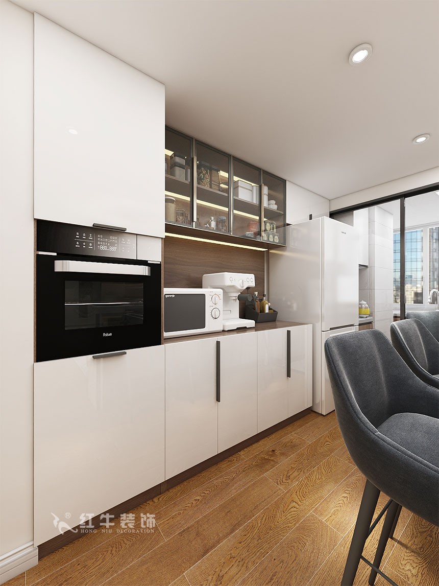 西廚部分的柜體與客廳背景墻的柜體選擇了同樣的材質,產生了遙相呼應的效果,使得居家空間更具有整體性。