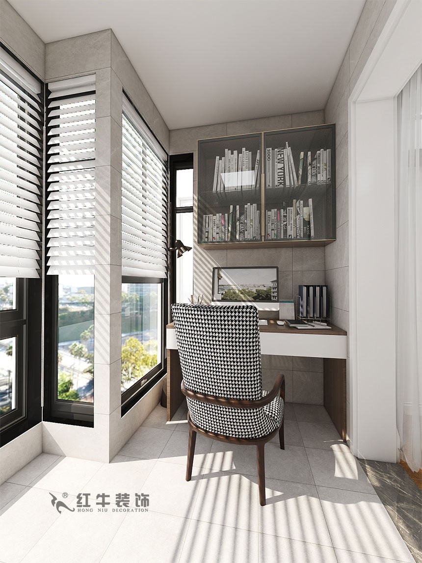 次臥的陽臺被打造成書房,搭配百葉窗,可以很好地調節光線,創造出舒適的學習環境。
