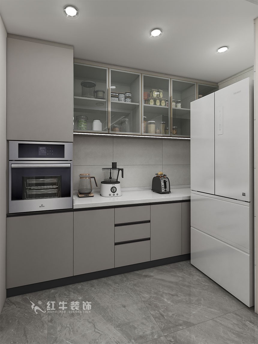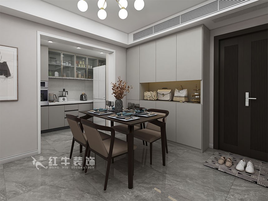 在整個客餐廳的空間設(shè)計方面,摒棄了應(yīng)有的理想方案,采用大膽的手法將廚房空間進行了中西廚的劃分,融入進了整個公共空間,實用的同時又能體現(xiàn)現(xiàn)代簡約的整體感官。