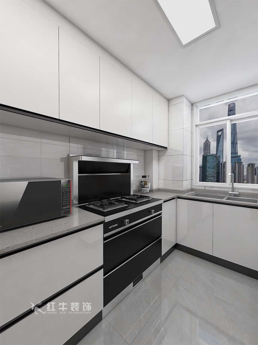 本案設計業主兩代人居住,父母做未來養老房,女兒第二居所。通過布局改造,增大廚房面積,北臥門移動位置,顯得空間更加修長。廚房通過斜墻改造。將餐廳陽角有效覆蓋。使空間變得圓潤。廚房集成灶的使用,釋放出了吊柜的空間。