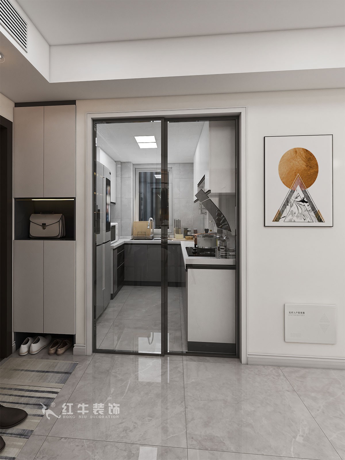 房子就是比較常規的四房兩廳的戶型,客戶需要很多的收納空間,同時四個房間都要保留,廚房也整體擴出來了,增加了鞋柜,也增加了櫥柜臺面空間。