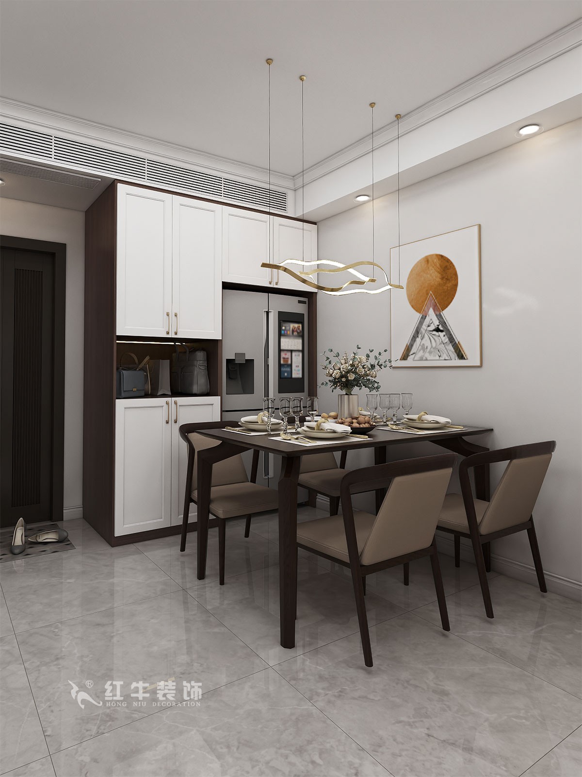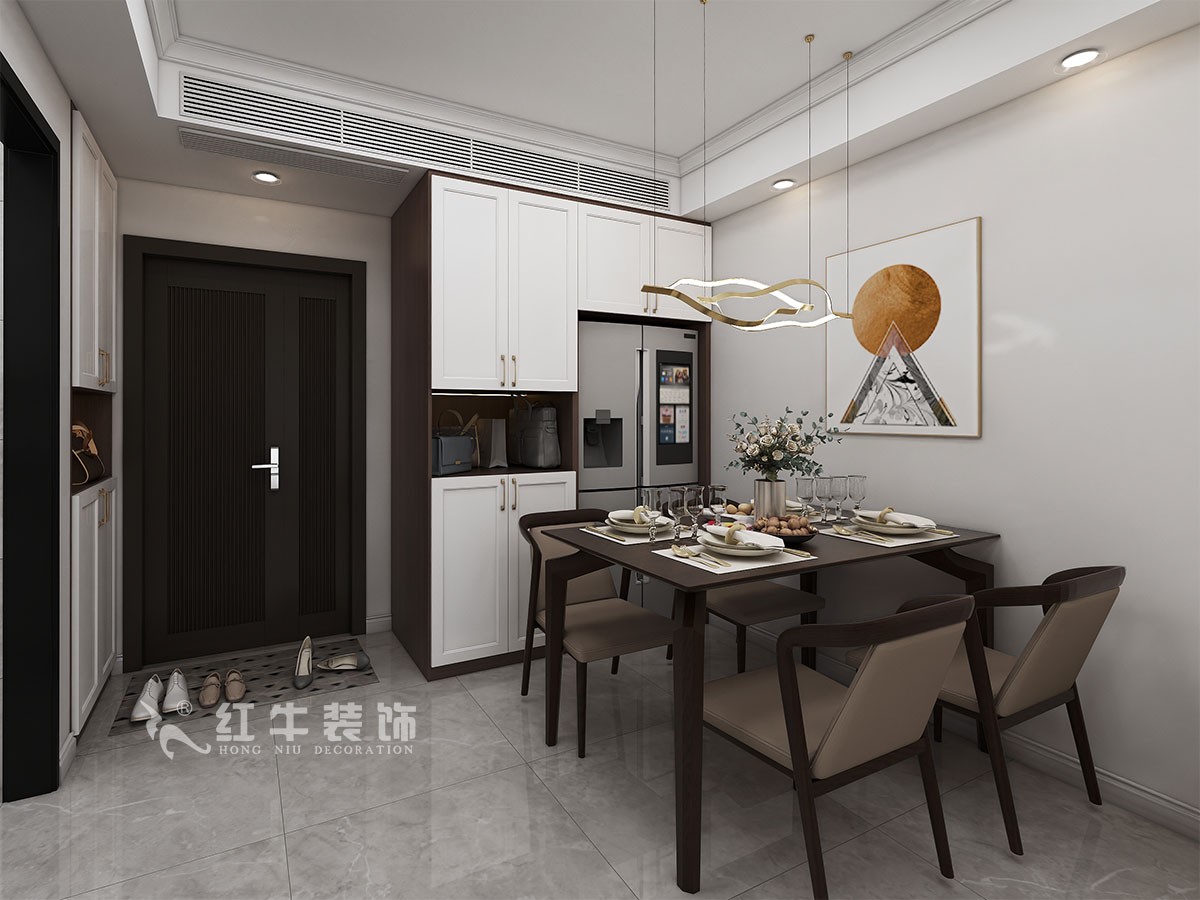 入戶門廳開間增加餐邊柜,與冰箱齊平,即增強(qiáng)廚房空間,又提升空間儲藏。
