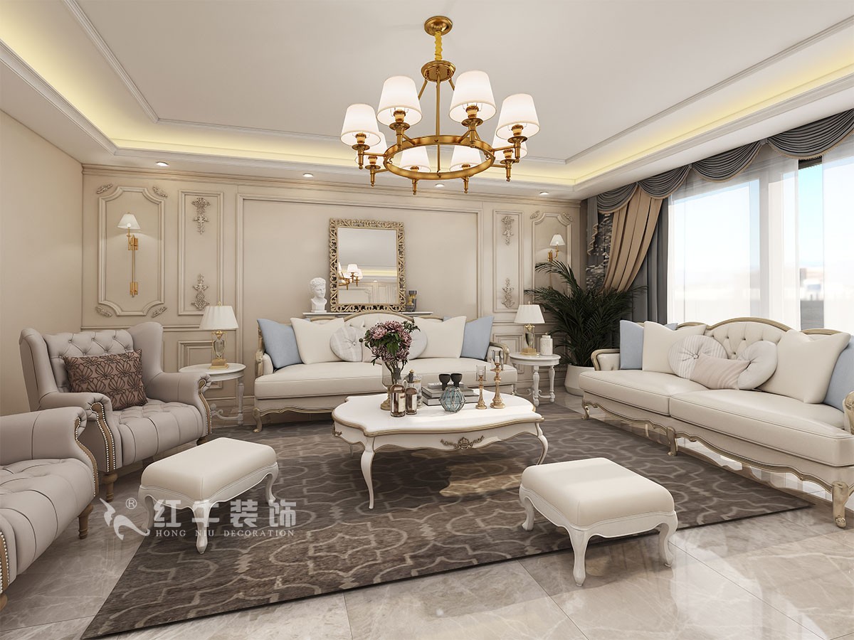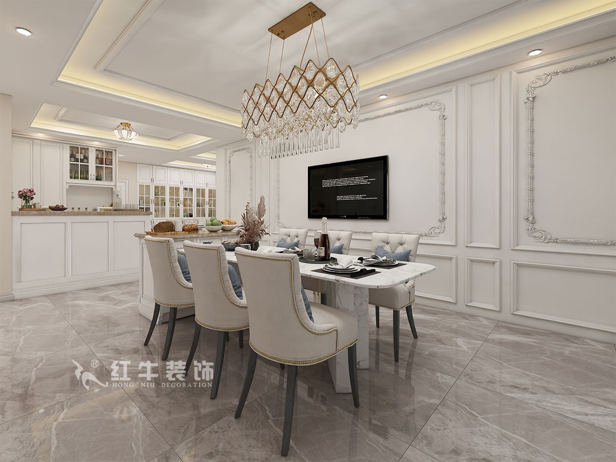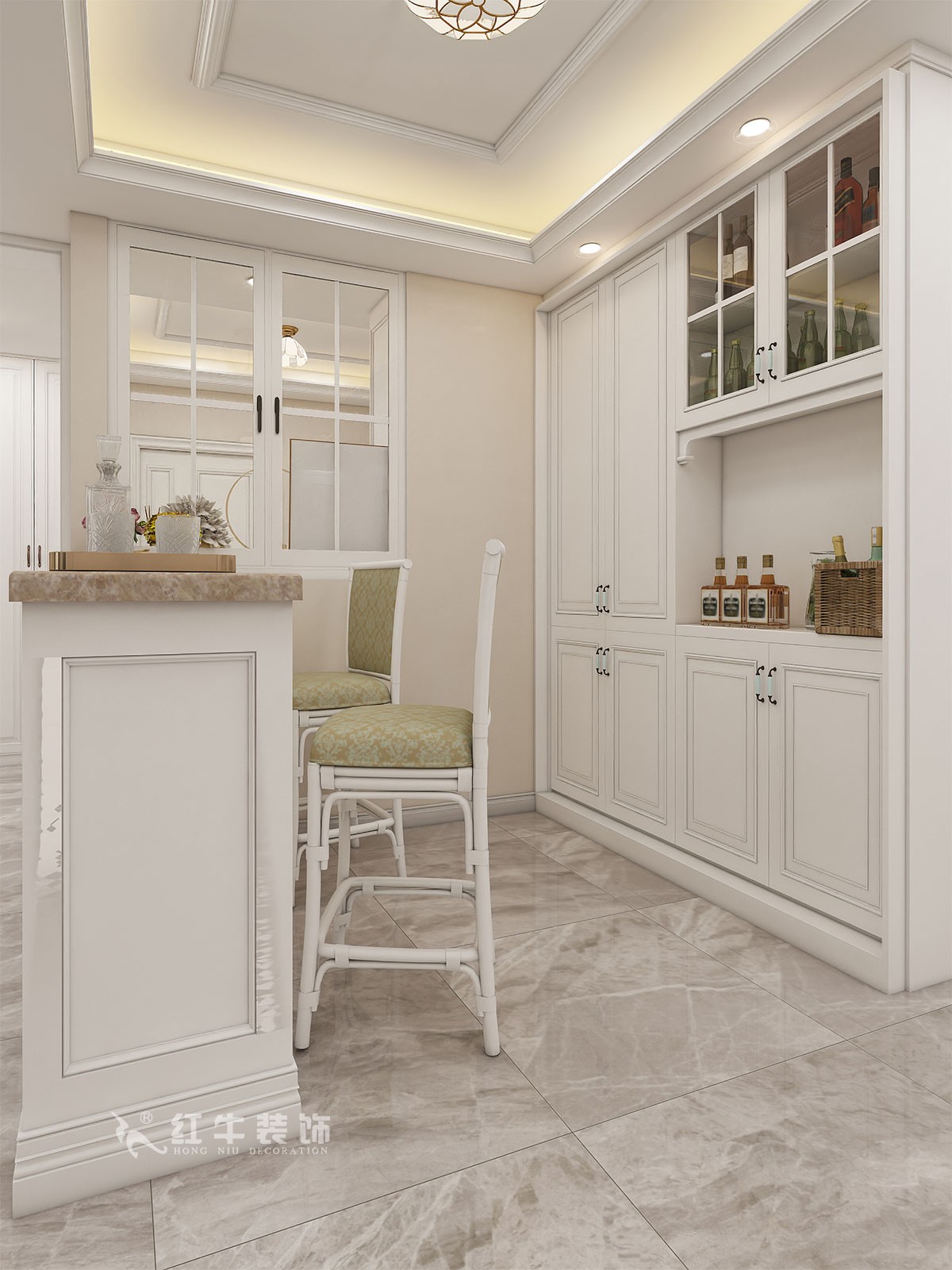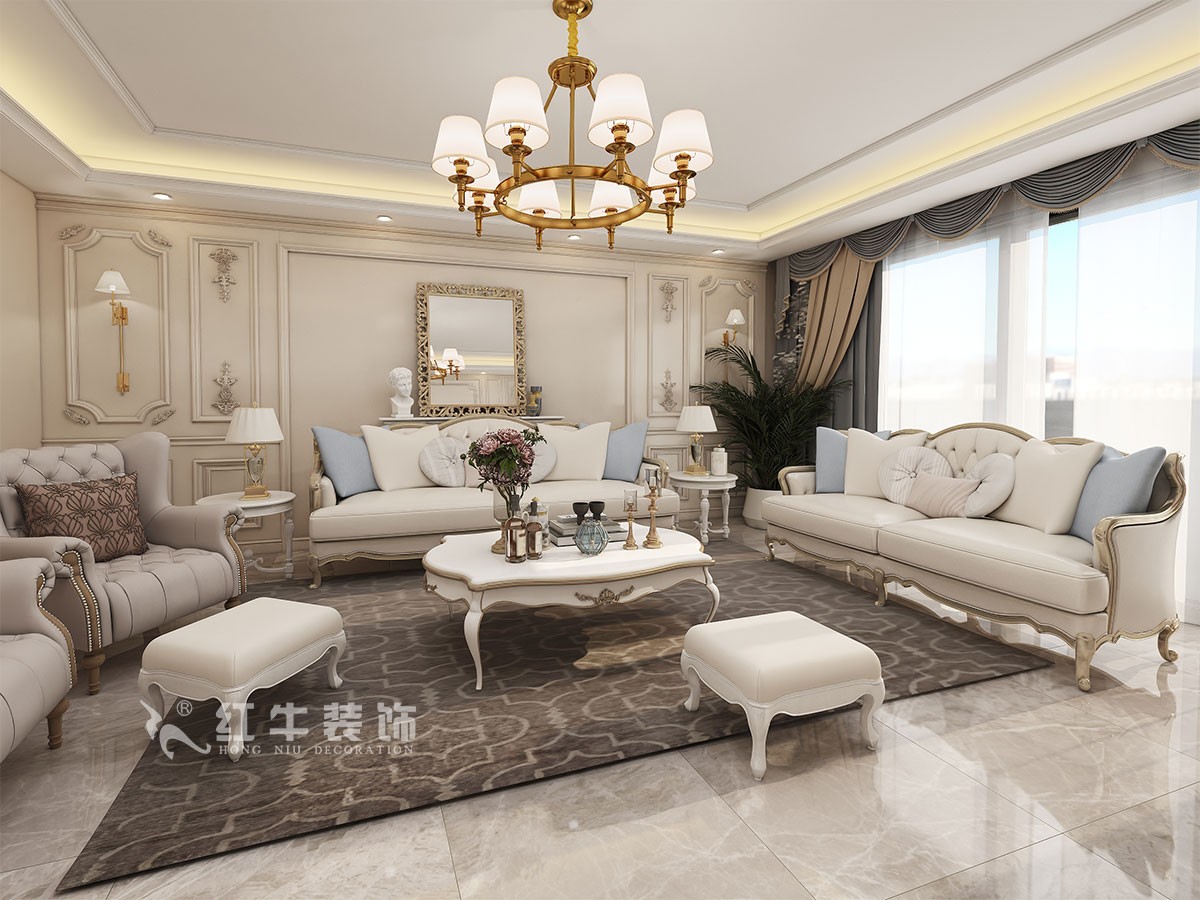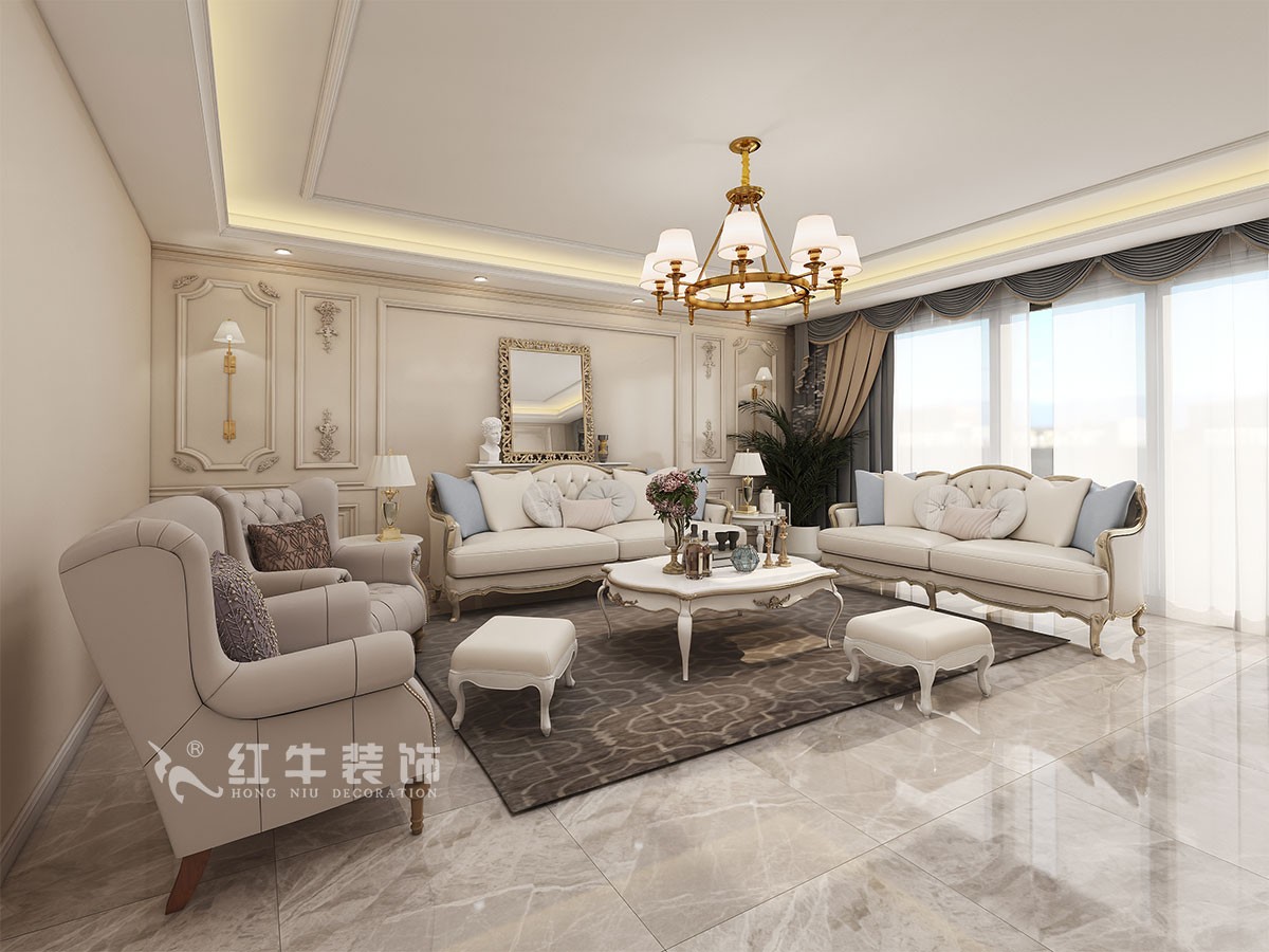 此房屋裝修規劃是以后期業主家庭聚會的房子,業主對美要求有自己的見解,希望未來的房子有顏色,有氣質,最終確定了美式,而本案在設計時其特色是將設計的元素、色彩、照明、原材料都體現美式的大氣,但是對材料的色彩質感要求很高。因此,無論總墻面,還是頂面都用美式線條做裝修,配合家具的曲線,讓整個空間顯得柔美。