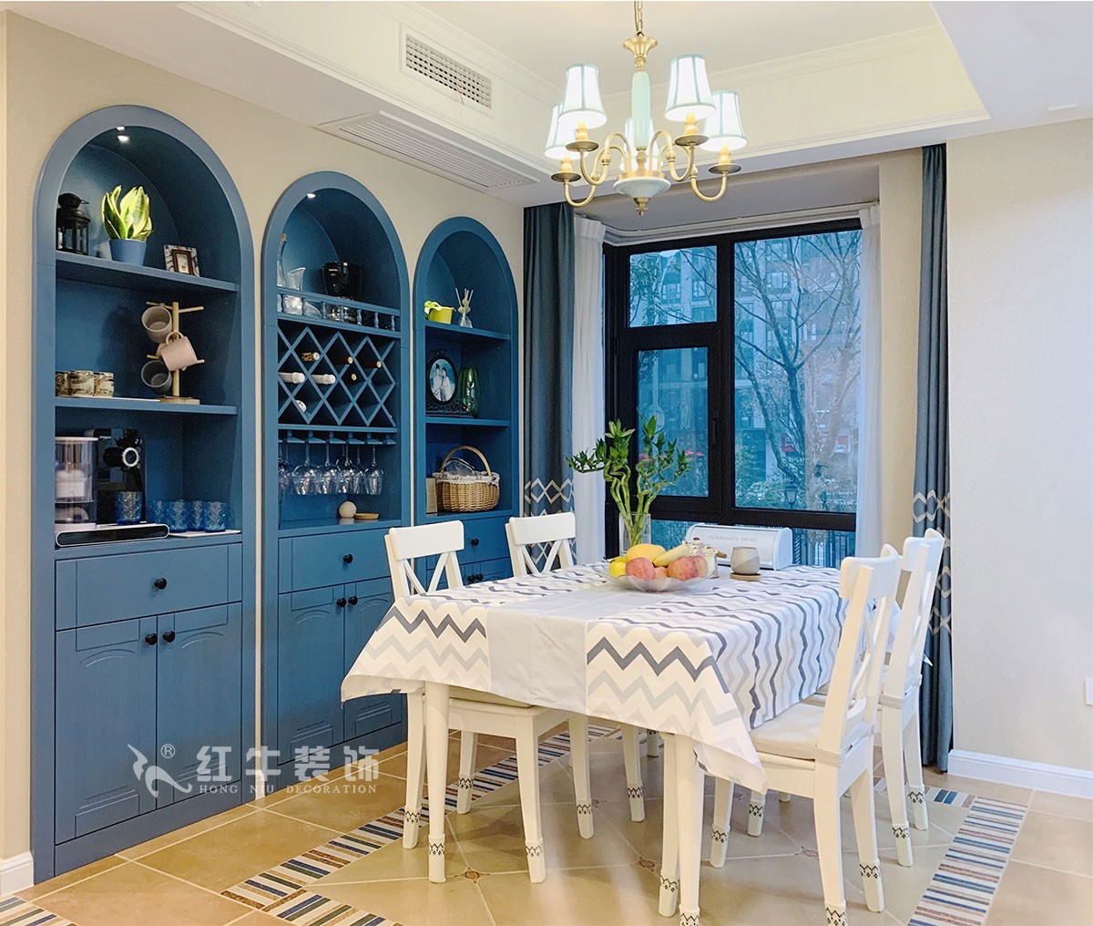 以白色為主色調的餐廳,顯得尤為純凈雅致,最吸睛的就是藍色的內嵌的置物架,頂部的拱形設計就是地中海風格的典型特征。