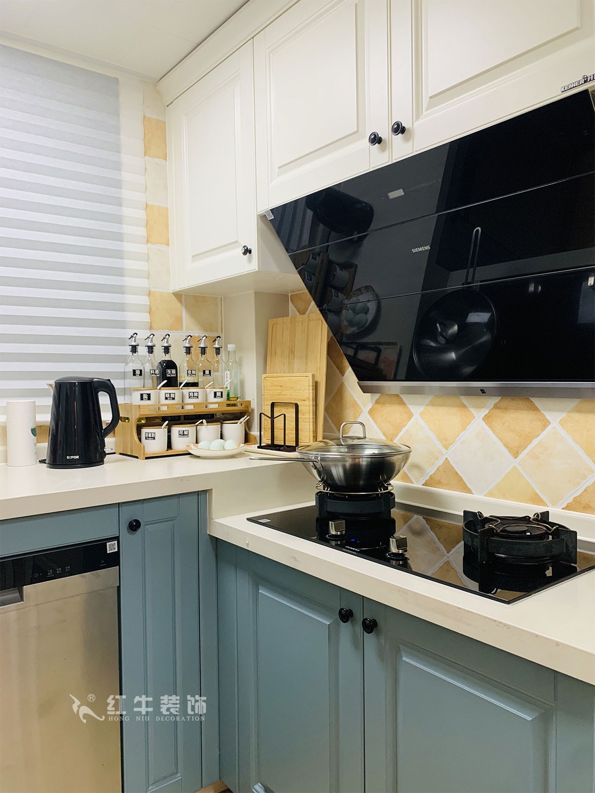 櫥柜柜門的顏色決定了整個廚房的色調,給燥熱的廚房空間帶來一絲清涼。