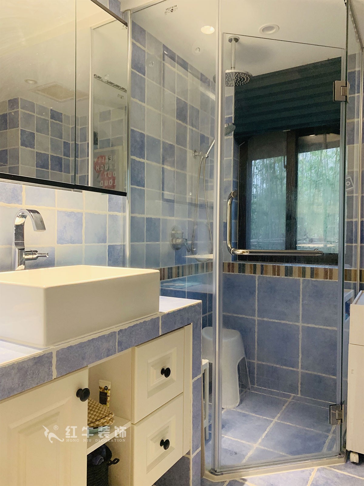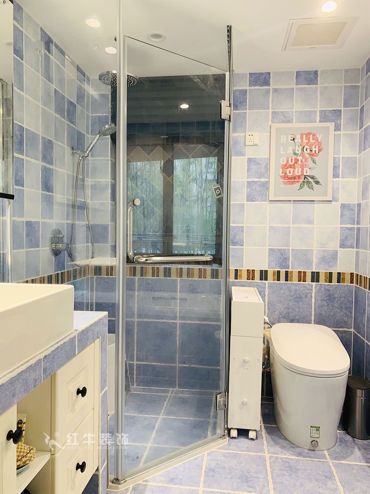 這是主臥的衛生間,不同的藍色、白色瓷磚拼貼在一起,在井然有序中又體現出生動和變化,看著感覺心情舒暢。