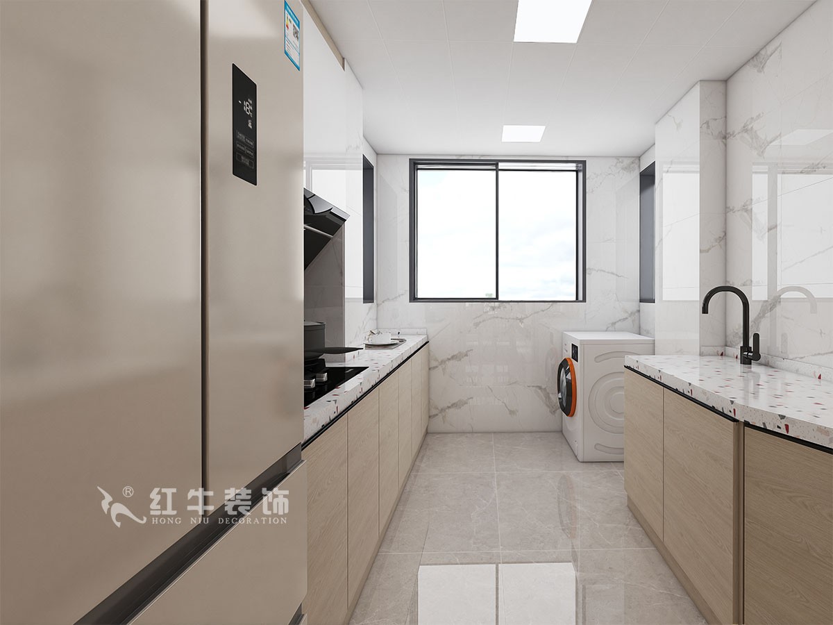 入戶門廳開間增加餐邊柜,增加入戶儲藏與餐邊柜,滿足小戶型的收納需求,生活陽臺與廚房打通,即增強廚房空間,又提升空間利用率。