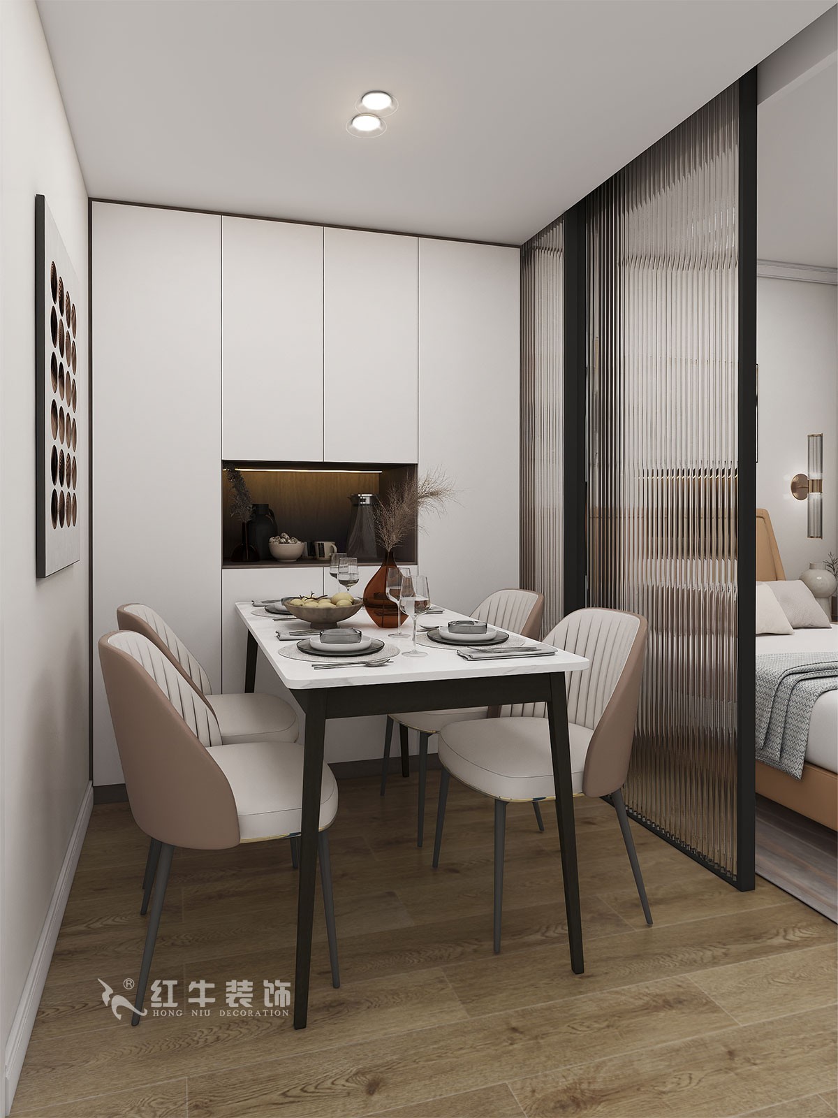此案主要是一家五口居住,在舒適度上要求比較高,臥室是整套房子中最私人也是最體現出溫馨休閑感的空間,在設計時體現出靜謐舒適的感覺,并且與其他空間明顯的區別,把原本臥室用透光的移門隔斷和餐廳隔開,這樣餐廳的采光更好,區域劃分明顯,動靜分離。吊頂簡潔大氣,配以輕現代家具,完美闡釋了簡約風格。整體現代簡約風格的設計,搭配上顯眼的綠色植物讓整個空間呈現出一種生機勃勃的自然美。