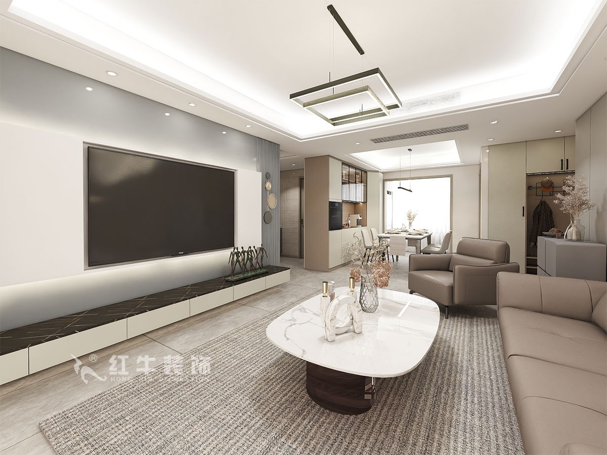 在功能方面,客廳是主人品味的象征,體現了主人品格、地位,燈光則以自然光為基調,頂部做了回光燈帶的吊頂。沙發背景采用硬包處理,整體溫馨大氣,電視背景墻采用調色,簡潔大氣。